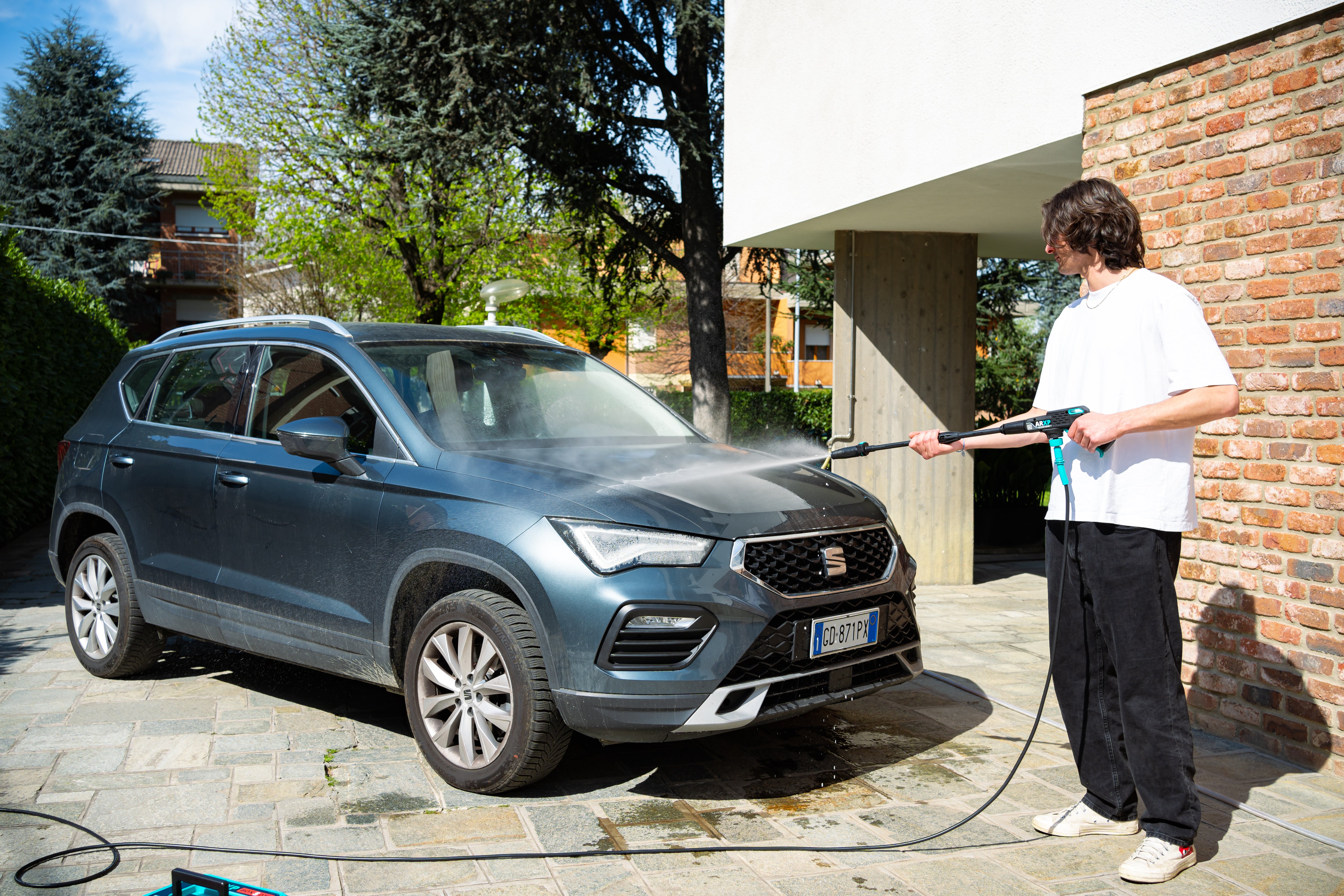 If you don’t have the optional brushes, you can still use just the adjustable jet nozzle – switching between fan and pencil spray settings as needed based on the level of dirt. For the vehicle’s painted surfaces though, only use the fan spray while maintaining some distance to avoid potential damage.