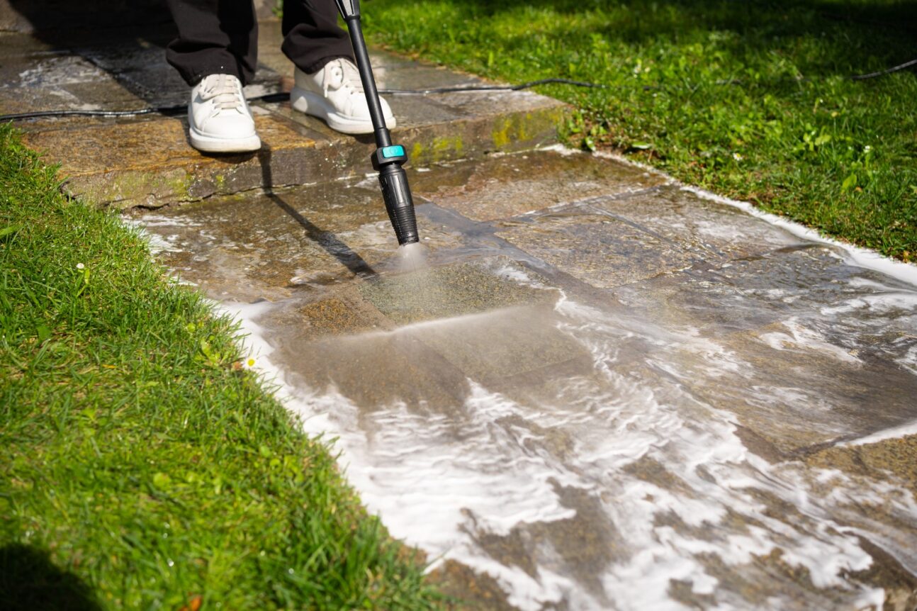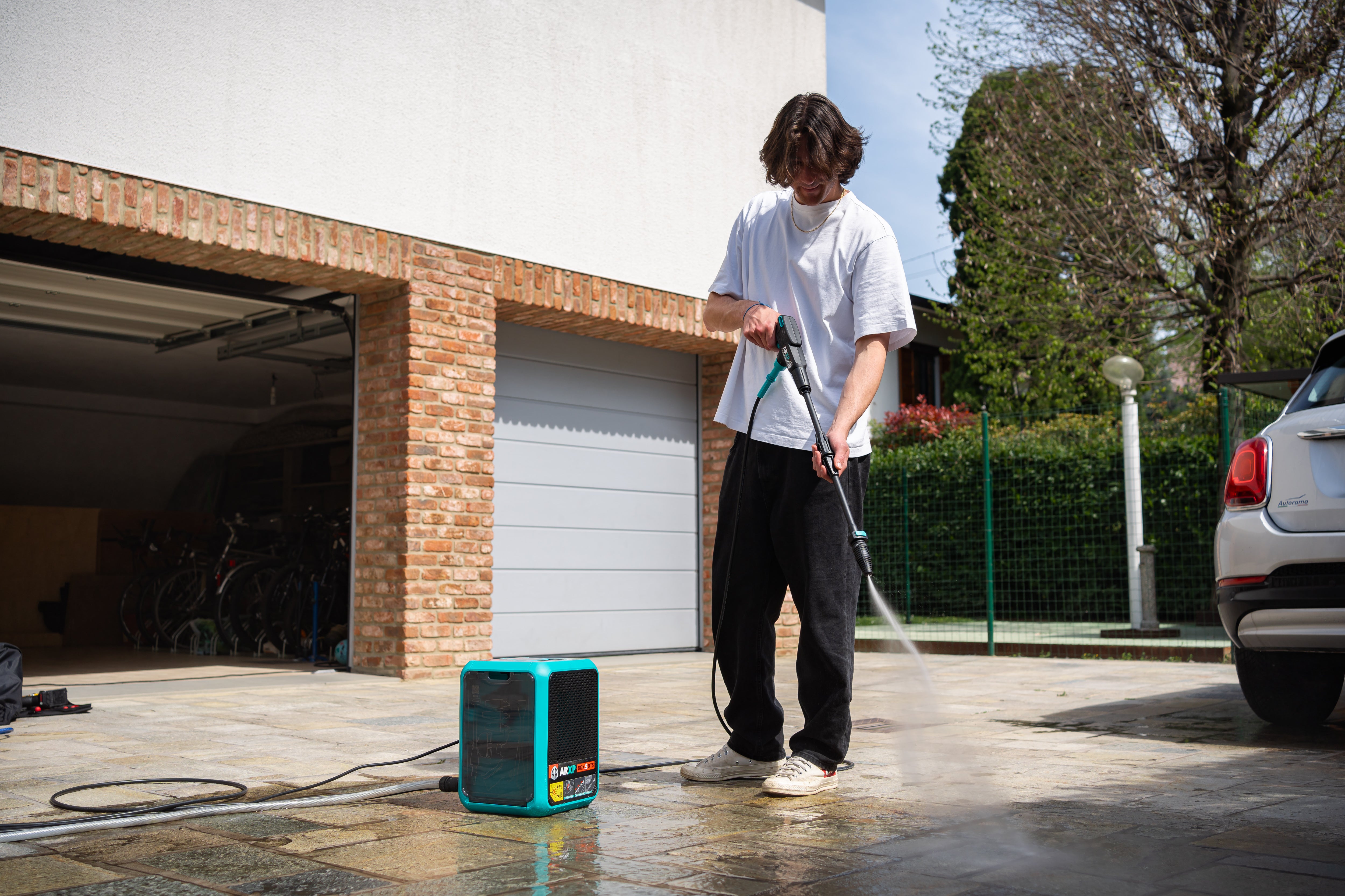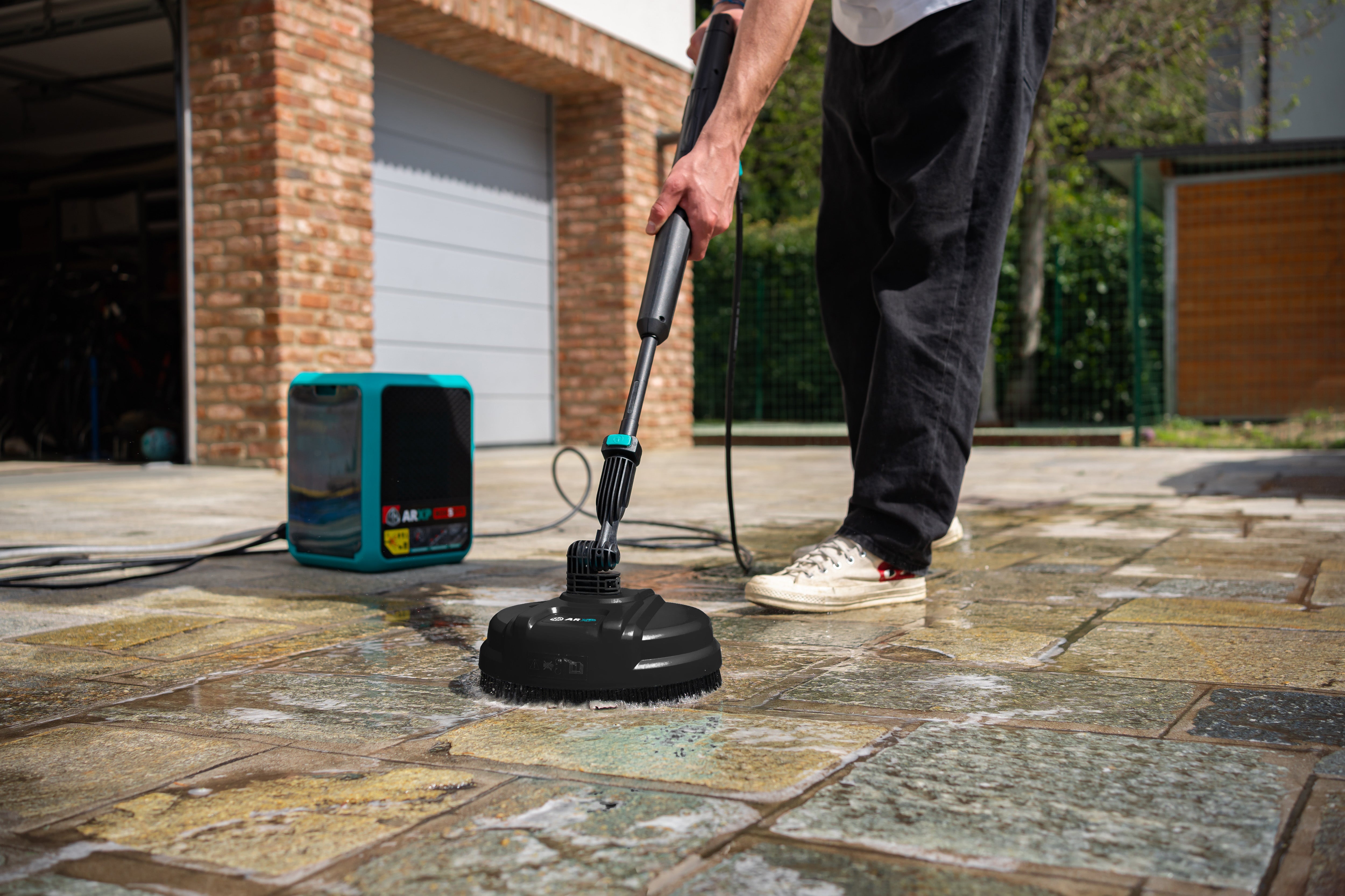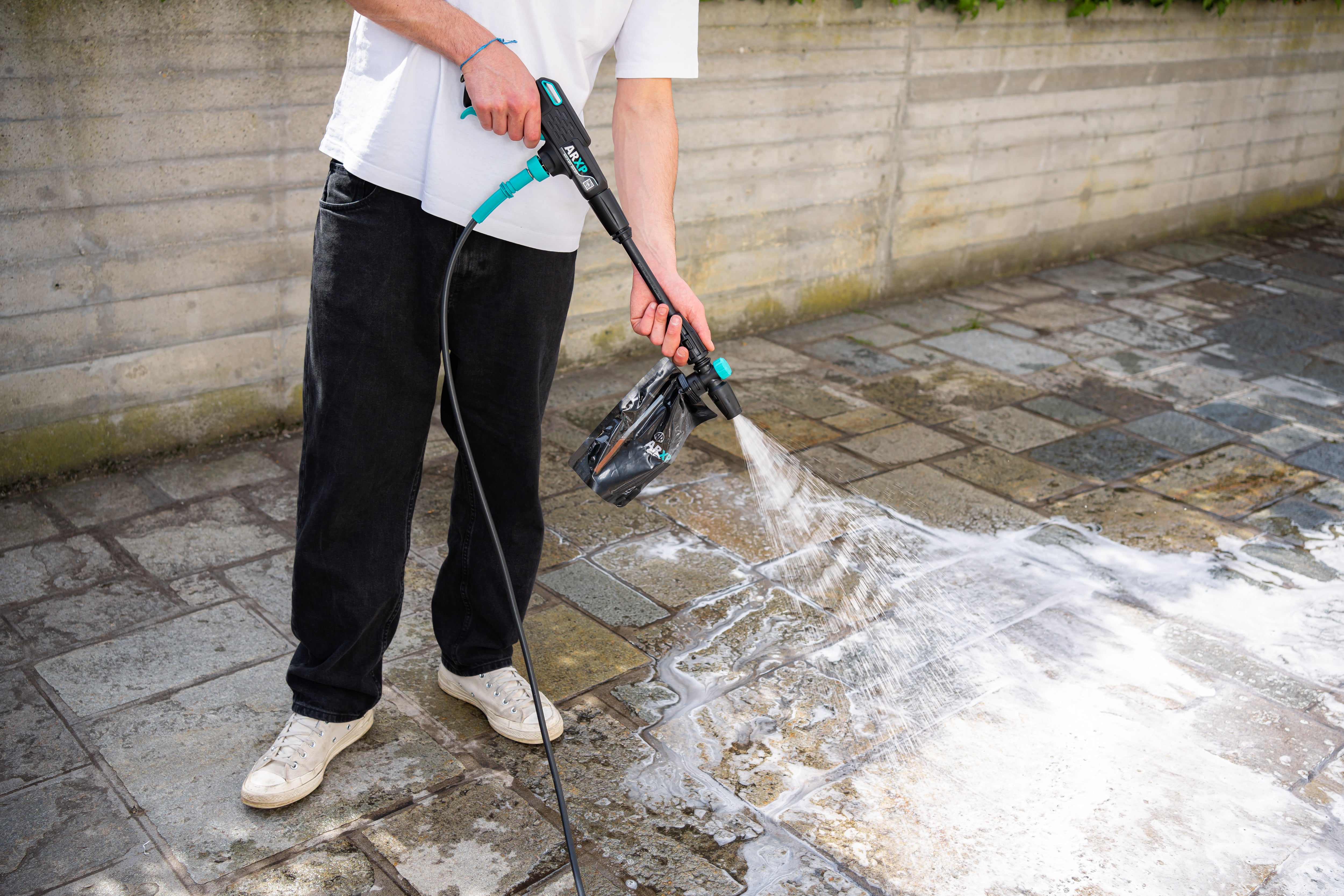 For optimal cleaning and sanitisation, you can apply a dedicated pressure washer detergent solution to the floor – like the Universal formula, the Walls & Stones detergent for masonry surfaces, or the Decking detergent for wood floors. This can be done using either the high-pressure foam lance included or the optional Aquasweeper surface cleaner.