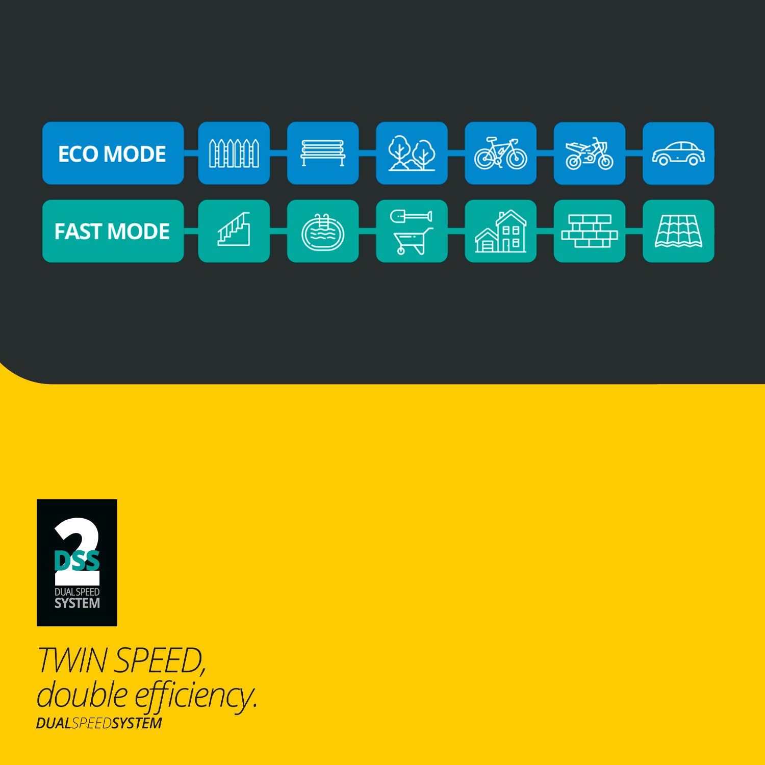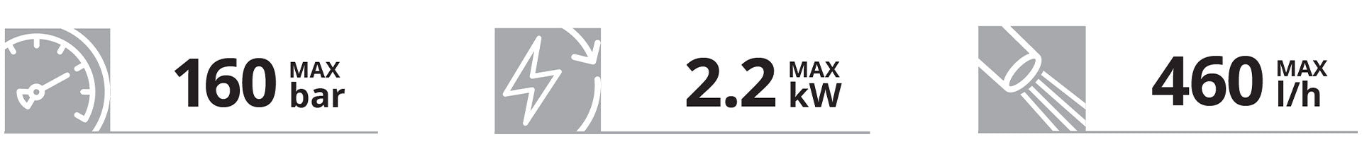 ARXP 160P DSS is the high pressure washer with DSS (Dual Speed System). Thanks to a two-speed motor, users can select different performance depending on requirements, by just turning the special POWER SWITCH. ECO mode optimises consumption to use up to 30% less water and electricity.